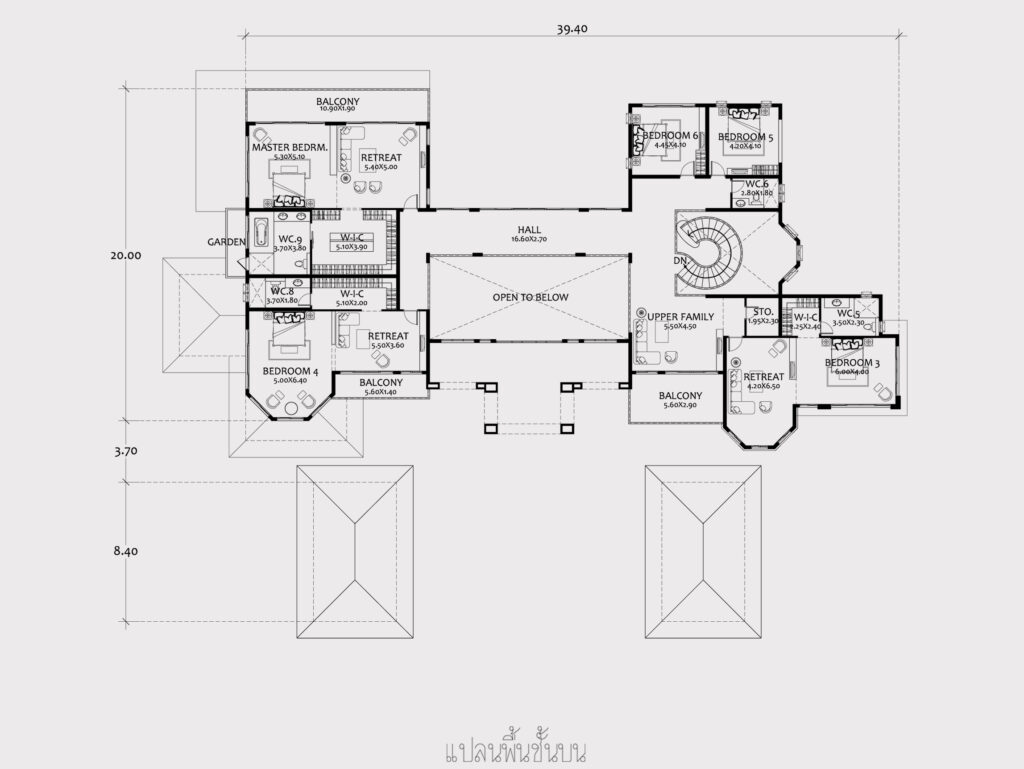 แบบบ้านสองชั้น สไตล์คอนเทมโพรารี่ ออกแบบวางผังอาคาร เป็นรูปตัว H แยกโครงสร้างของตัวบ้าน กับโรงรถออกจากกัน เพื่อเปิดมุมมอง และการระบายอากาศที่ดีสำหรับทุกส่วนของบ้าน หลังนี้เป็นบ้านขนาดใหญ่ ที่เน้นการใช้งานที่ลงตัว และหรูหราสง่างาม ด้านหน้าโดดเด่นด้วยโถงทางเข้าบ้าน เข้าสู่ห้องรับแขกขนาดใหญ่ ที่ตั้งใจออกแบบดูกว้างขวาง สง่างาม มีฝ้าเพดานสูงแบบ ดับเบิ้ลโวลุ่ม ( Double volume) ที่สามารถมองเห็นสวนสวนด้านหลังบ้าน โซนห้องนอน จะประกอบด้วยห้องหนังสือ และห้องนอนขนาดใหญ่ ถึง 2 ห้อง ส่วนห้องพักผ่อน จะต่อเนื่องกับส่วนทานอาหาร ,ห้องครัว ,ครัวไทย และโซนแม่บ้าน อีกฟากหนึ่งจะเป็นส่วนออกกำลังกาย มีทั้งห้องออกกำลังกาย และสระว่ายน้ำ ใกล้ๆกันนั้น บันไดหลักที่จะขึ้นสู่ชั้นบน ก็ถูกออกแบบให้หรูหราสง่างามเช่นกัน ด้วยบันไดโค้งคู่กับโถงสูง ที่โดดเด่นไม่แพ้ส่วนห้องรับแขกทางด้านหน้าบ้านเลย จากบันไดหรูหรา ขึ้นสู่ชั้นบน มีห้องนั่งเล่นขนาดใหญ่ มีระเบียง และมองเห็นมุมมองทางด้านหน้าบ้านได้ ในส่วนของห้องนอน ได้ออกแบบ ให้มีห้องนอนขนาดใหญ่ ที่มีส่วนนั่งเล่น แยกเป็นสัดส่วนจากส่วนนอน ทั้งยังมีส่วนแต่งตัวขนาดใหญ่ และห้องน้ำในตัว ถึง 3 ห้อง และห้องนอนขนาดกลาง อีก 2 ห้องที่ใช้ห้องน้ำร่วมกัน ถ้าคุณต้องการบ้านสำหรับครอบครัวใหญ่ ที่ออกแบบใช้งานคุ้มค่าทุกตารางนิ้ว จัดการทั้งพื้นที่ส่วนกลาง และพื้นที่ส่วนตัว เพื่อให้เกิดพื้นที่ความสุข…สำหรับทุกคนในครอบครัวคุณได้อย่างแน่นอน