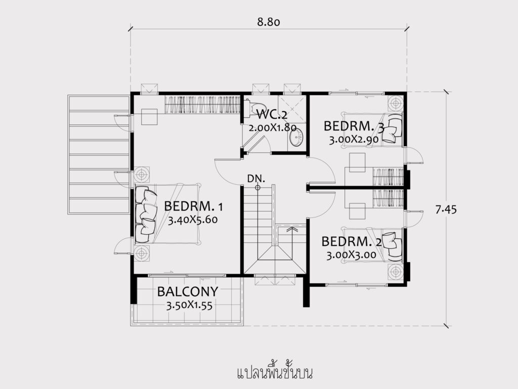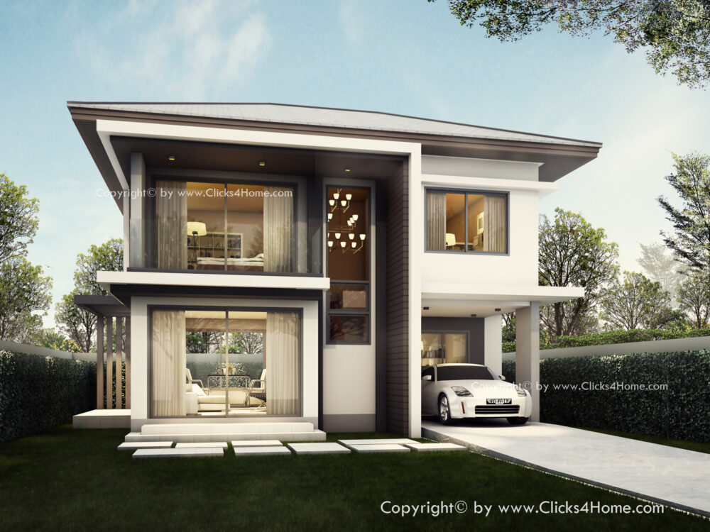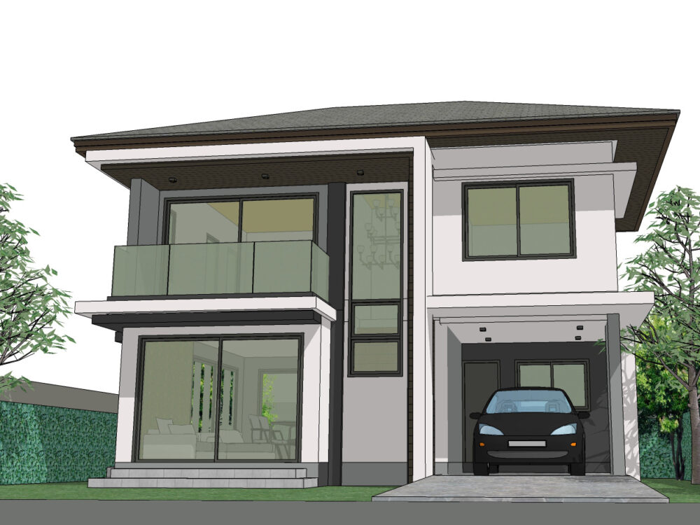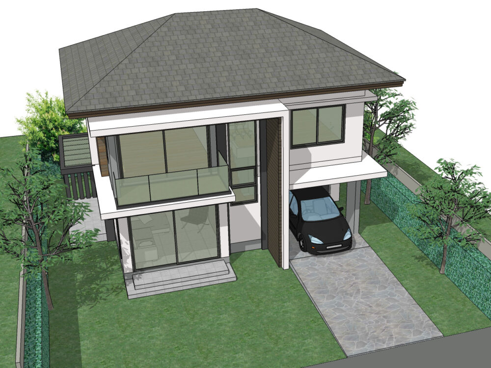 แบบบ้านสวยขนาดเล็ก สไตล์ โมเดิร์นคอนเทมโพรารี่ ด้านหน้าบ้าน ถูกเน้นให้ดูโดดเด่น และชัดเจน ด้วยเส้นสาย สไตล์โมเดิร์น ชั้นล่าง จัดให้โถงห้องรับแขก ต่อเนื่องกับส่วนทานอาหาร ทำให้บ้านดูกว้าง โปร่งโล่ง สบาย ทั้งยังสามารถระบายอากาศที่ดี ด้วยหน้าต่างขนาดใหญ่ถึง 3 ด้าน แยกเป็นสัดส่วนกับส่วนครัวไทยซึ่งอยู่อีกด้านหนึ่งซึ่งออกแบบให้มีขนาดใหญ่มากพอ ที่จะช่วยให้คุณทำอาหารหนัก โดยไม่มีกลิ่นรบกวนภายในบ้าน แม้จะเป็นบ้านขนาดเล็ก แต่ห้องนอนใหญ่นั้น ขนาดไม่เล็กเลย ด้วยการจัดพื้นที่ส่วนนอน ที่ดูกว้างขวาง พร้อมโซนตู้เสื้อผ้า ที่ต่อเนื่องกันกับห้องน้ำซึ่งใช้ร่วมกันกับ ห้องนอนขนาดเล็กอีก 2 ห้อง เรียกได้ว่า แม้พื้นที่ภายในจะจำกัด แต่ออกแบบใช้งานคุ้มค่าทุกตารางนิ้ว เหมาะกับการเริ่มต้นใช้ชีวิตของครอบครัวเล็กๆ ที่จะได้อยู่ร่วมกันอย่างเป็นส่วนตัว เกิดเป็นพื้นที่ความสุข…สำหรับทุกคนในครอบครัวคุณอย่างแน่นอน