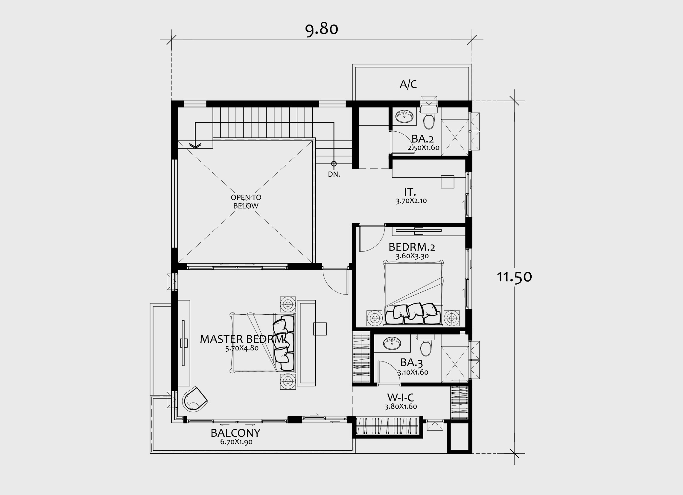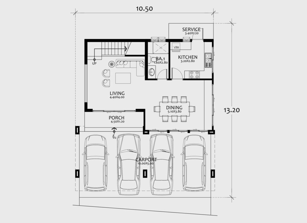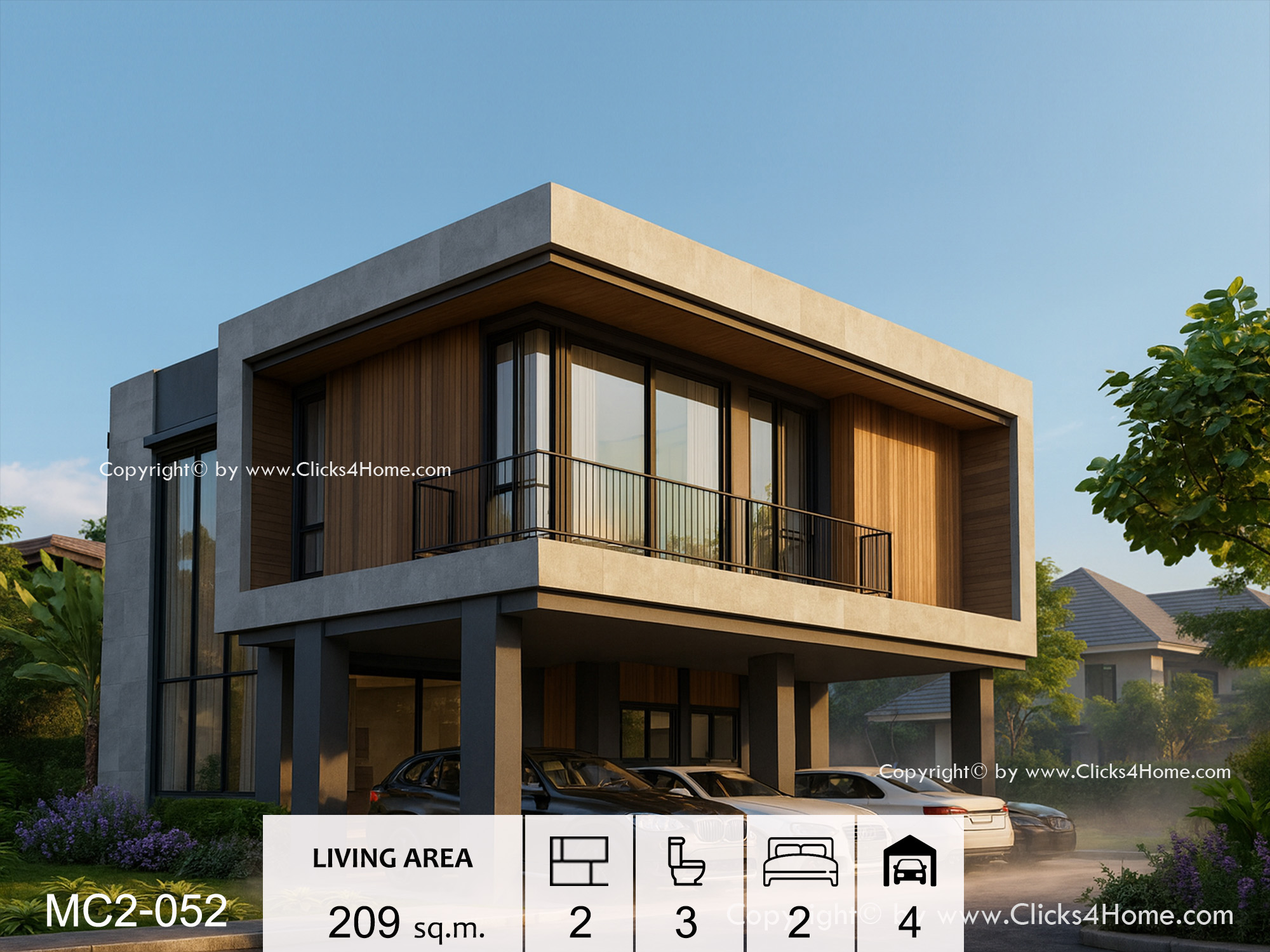 แบบบ้านสองชั้น สไตล์โมเดิร์นคอนเทมโพรารี่ เป็นบ้านหลังไม่ใหญ่มาก แต่มีที่จอดรถถึง 4 คัน วางยาวตลอดความยาวด้านหน้าบ้าน ตัวบ้านถูกออกแบบให้มีเส้นสายแบบโมเดิร์น เรียบง่าย แต่หรูหราในรายละเอียด ฟังค์ชั่นการใช้งานด้านหน้าบ้านตัวบ้าน ออกแบบให้ปิดล้อมพื้นที่ส่วนตัวทางด้านหลังบ้าน โดยด้านหนัาบ้านมีที่จอดรถในร่มถึง 4 คัน มีเฉลียงทางเข้าบ้านเปิดสู่โถงสูง (Double volume) ของห้องรับแขก ต่อเนื่องกับส่วนทานอาหร ที่เชื่อมต่อกับครัวและพื้นที่ซักล้างทางด้านหลังบ้าน ที่ชั้นสอง จัดให้มีห้องนั่งเล่นส่วนกลางขนาดเล็ก ห้องนอนใหญ่ 1 ห้อง ที่มีส่วนแต่งตัวและห้องน้ำในตัว มีห้องนอนเล็ก และห้องน้ำส่วนกลางอีก 1 ห้อง ครบครันสำหรับครอบครัวที่ไลฟ์สไตล์ทันสมัยเช่นคุณ