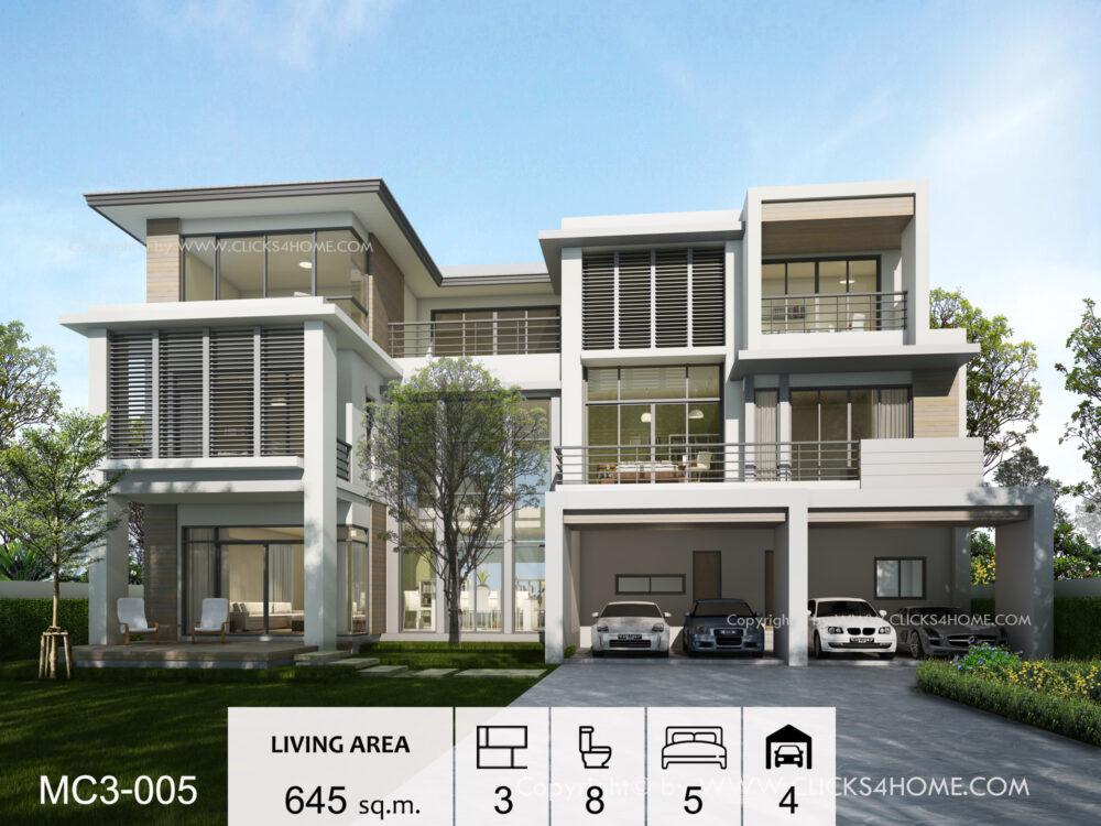 แบบบ้านสามชั้น สไตล์โมเดิร์นคอนเทมฯ เป็นบ้านขนาดใหญ่ 5 ห้องนอน 8 ห้องน้ำ พื้นที่จอดรถในร่มถึง 4 คัน พื้นที่ใช้สอยภายในบ้านที่ออกแบบให้ใช้งานได้อย่างต่อเนื่อง และสะดวกสบายในส่วนของชั้นล่างไม่ว่าจะเป็นส่วน โรงรถ ห้องเก็บของ ห้องเตรียมอาหาร หรือห้องครัวเป็นต้นอีกทั้งยังออกแบบให้มีส่วนพื้นที่สีเขียว แลดูต่อเนื่องกับพื้นที่ที่ใช้งานเป็นประจำเพื่อให้ผู้อยู่อาศัยได้สัมผัสกับธรรมชาติภายนอกห้องรับประทานอาหารเพดานสูงแบบดับเบิ้ลโวลลุ่ม (Double Volume)เพื่อความโปร่งสบาย ต่อเนื่องกับพื้นที่ชั้นสองที่มีห้องทำงานแยกเป็นสัดส่วนห้องนอนขนาดใหญ่ มีห้องน้ำในตัว พร้อมด้วยห้องพระและระเบียง เพื่อชมทัศนียภาพภายนอกในส่วนของพื้นที่ชั้นสามยังจัดวางห้องสำหรับการออกกกำลังกาย และห้องสันทนาการสำหรับครอบครัวห้องนอนขนาดใหญ่อีก 2 ห้องซึ่งมีห้องน้ำในตัวเช่นกัน และมีโซนจัดสวนเพื่อความร่มรื่นของอาคารบ้านหลังนี้จึงตอบโจทย์ทุกไลฟ์สไตล์ของผู้อยู่อาศัย และเป็นบ้านสำหรับการพักผ่อนสำหรับครอบครัวอย่างแท้จริง