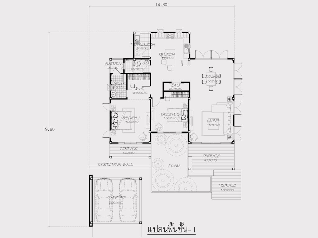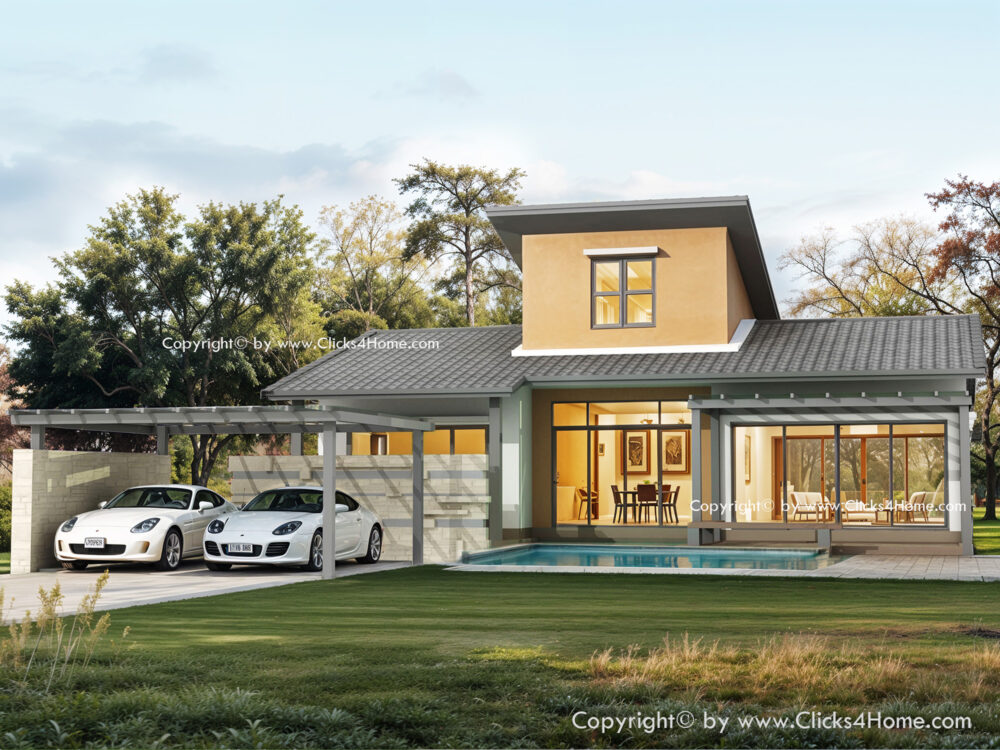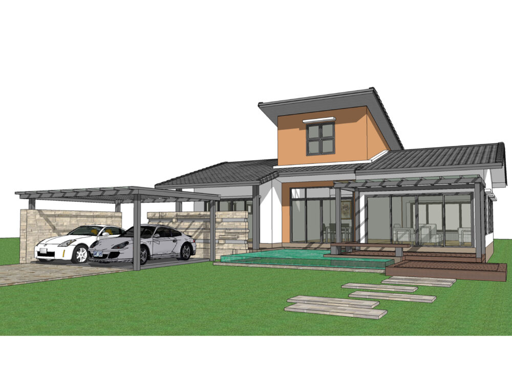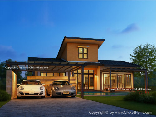 แบบบ้านชั้นเดียว เรียบและทันสมัย ในแบบสไตล์โมเดิร์น แต่เพิ่มความน่าสนใจ ด้วยการยกผนังเพิ่มห้องใต้หลังคา เพื่อให้รูปทรงอาคารมีความน่าสนใจขึ้น ทางเข้าเป็นเฉลียงทางเข้าขนาดใหญ่ จัดวางแบบมีลูกเล่นล้อมรอบด้วยสระน้ำสไตล์รีสอร์ท ก่อนจะเข้าสู่ห้องรับแขกขนาดใหญ่ ต่อเนื่องกับห้องทานอาหาร ที่โปร่งโล่งสบาย เนื่องจากการระบายอากาศที่ดีของหน้าต่างขนาดใหญ่ทั้ง 3 ด้าน ห้องครัวหลัก ขนาดใหญ่แยกเป็นสัดส่วนต่อเนื่องกับครัวไทยทางด้านหลังบ้าน ที่จะช่วยป้องกันกลิ่นรบกวน เวลาคุณทำอาหารหนัก ห้องนอนได้มุมมองสวยด้านหน้าบ้านทั้ง 2 ห้องห้องนอนใหญ่ครบครันด้วย ส่วนนอนเป็นสัดส่วนต่อเนื่องกับระเบียงส่วนตัว walk-in-closet และห้องน้ำที่สามารถเปิด เข้าไปยังสวนปิดส่วนตัวสไตล์รีสอร์ทได้ด้วย