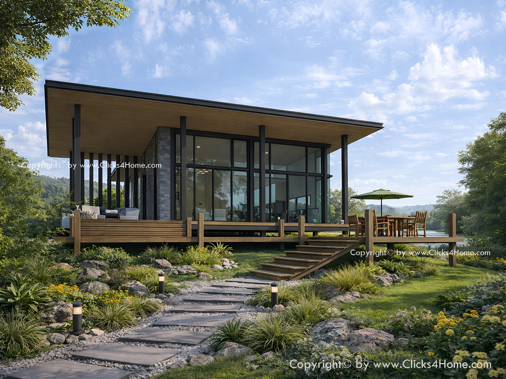 แบบบ้านชั้นเดียวหลังเล็ก สไตล์โมเดิร์นทรอปปิคอล รูปทรงทันสมัย แฝงด้วยรายละเอียด เส้นสาย แบบสถาปัตยกรรมเมืองร้อน พิเศษด้วยระเบียงด้านหน้าบ้าน ที่กว้างขวาง น่านั่ง เหมาะไว้สำหรับต้อนรับผู้มาเยือน ก่อนเปิดสู่ห้องนั่งเล่น ทานอาหาร ที่ต่อเนื่องกันกลายเป็นห้องขนาดใหญ่ แบบโถงสูง ล้อมรอบด้วยสวยสวยทั้ง 3 ด้าน ให้บรรยากาศสบายๆ เย็นสบายตลอดวัน เหมาะสำหรับเจ้าของบ้านที่ นิยมการพักผ่อนที่บ้าน จะได้อารมณ์เหมือนพักรีสอร์ทตลอดทั้งปี ทางด้านหลังบ้าน เป็นพื้นที่ของห้องนอน 2 ห้อง ห้องใหญ่มีห้องน้ำในตัว ส่วนห้องเล็กใช้ห้องน้ำส่วนกลาง ถ้าคุณเป็นเจ้าของบ้าน ที่นิยมบ้านอารมณ์รีสอร์ท รูปแบบสมัยใหม่ บ้านหลังนี้จะเติมเต็ม ทุกไลฟ์สไตล์ของครอบครัวสมัยใหม่เช่นคุณแน่นอน
