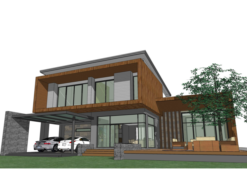 แบบบ้านสวย รูปแบบโมเดิร์นทรอปปิคอล ที่เน้นเฟรมไม้สีเข้ม แบบทรอปปิคอล ผสานกับความโปร่งโล่งของกระจก ด้วยช่องเปิดขนาดใหญ่ ดูทันสมัย ผนังภายนอกที่ชั้นบน ออกแบบให้เป็นผนังไม้สังเคราะห์ ช่วยเพิ่มความรู้สึกอบอุ่น ไม่ให้บ้านดูแข็งจนเกินไป ที่ชั้นล่าง ต้อนรับแขกผู้มาเยือนด้วย ห้องรับแขกขนาดใหญ่ เชื่อมต่อส่วนทานอาหาร และครัวแบบไอส์แลนด์ทางด้านหลังบ้าน ทำให้ห้องดูกว้างขวาง โปร่งโล่ง และยังสามารถระบายอากาศ จากหน้าบ้าน – หลังบ้านได้เป็นอย่างดี โดดเด่นที่บริเวณห้องรับแขก ดูกว้างขวาง ด้วยประตูขนาดใหญ่พร้อมกระจกเข้ามุมล้อมรอบด้วยระเบียงขนาดใหญ่ถึงสองด้าน แยกเป็นสัดส่วนกับห้องนอนที่กว้างขวางพอ ที่จะจัดให้เป็นห้องดูทีวี หรือห้องคอมพิวเตอร์ หรือห้องทำการบ้านของเด็กๆ ได้สบาย ส่วนชั้นบนมีห้องนอนเล็ก 2 ห้อง ห้องน้ำส่วนกลาง 1 ห้อง และห้องนอนขนาดใหญ่พิเศษ ที่หรูหรา พร้อมห้องwalk-in-closet ที่ต่อเนื่องกับห้องน้ำสวยสไตล์รีสอร์ททางด้านหลัง
