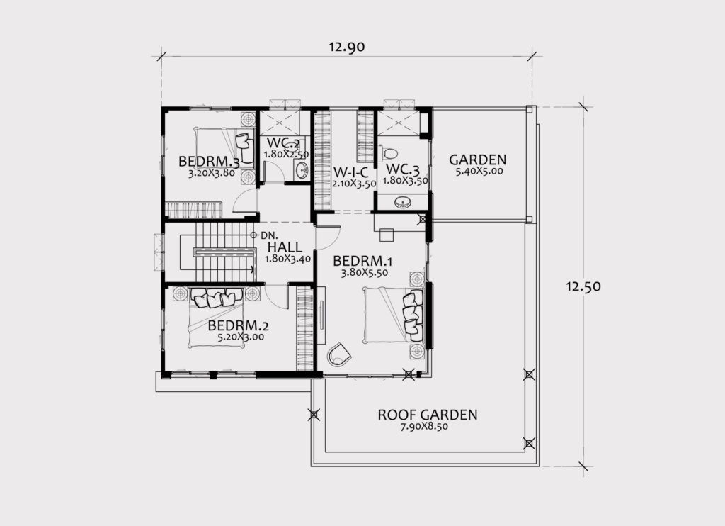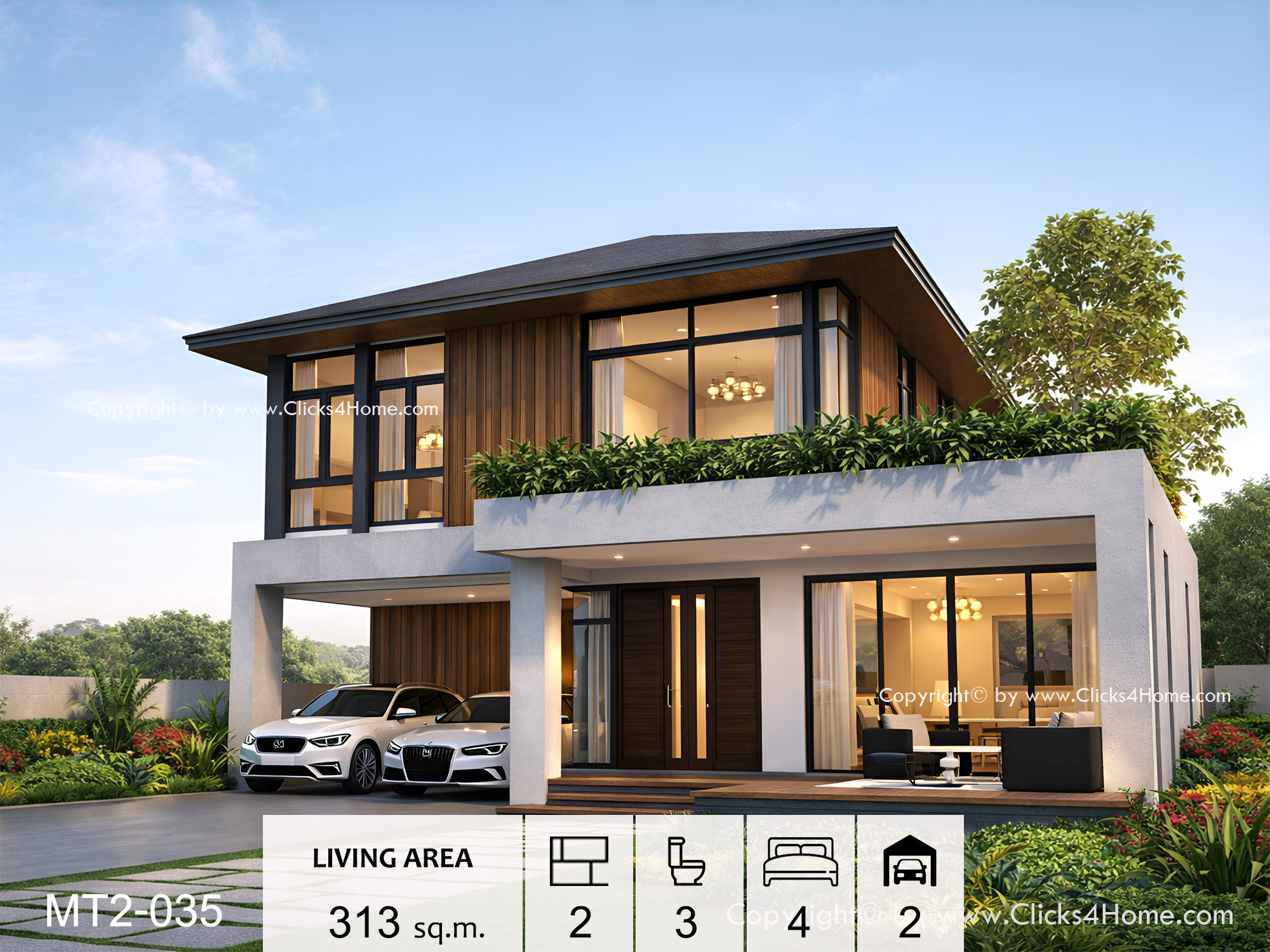 บ้านสวยสไตล์ Modern Tropical ด้วย เส้นสายสไตล์โมเดิร์น ประกอบกับช่องเปิดขนาดใหญ่ และเส้นนอนของผนังประดับด้วยวัสดุเลียนแบบไม้ทำให้บ้านหลังนี้ ดูทันสมัยแต่ก็อบอุ่นแบบตะวันออก มีส่วนนั่งเล่นชมสวนหน้าบ้าน เชื่อมต่อกับห้องรับแขกขนาดใหญ่ ต่อเนื่องกับส่วนทานอาหาร ทางด้านหลังบ้าน ด้วยช่องเปิดขนาดใหญ่ ทำให้พื้นที่ส่วนนี้ดูกว้าง โปร่งโล่ง และระบายอากาศได้ดี ที่ชั้นล่างนี้ ยังมีห้อง นอนขนาดกระทัดรัด ที่แยกเป็นสัดส่วน เพื่อความเป็นส่วนตัว ต่อเนื่องกับห้องทานอาหาร สามารถปรับเปลี่ยนเป็นห้องคอมพิวเตอร์ หรือห้องทำการบ้านของเด็กๆ ชั้นบนมีห้องนอน 3 ห้อง ห้องนอนเล็กสองห้องใช้ห้องน้ำร่วมกัน ส่วนห้องนอนใหญ่ ที่กว้างขวาง ทั้งส่วนนอน และห้อง walk-in-closet ขนาดใหญ่ ต่อเนื่องกับห้องน้ำสไตล์รีสอร์ท มีสวนในห้องน้ำ เพื่อความเป็นส่วนตัว และที่ห้องนอนใหญ่นี้ ยังมีสวนบนหลังคาขนาดใหญ่สำหรับเจ้าบ้าน ที่รักธรรมชาติ ชอบปลูกต้นไม้เป็นชีวิตจิตใจ และยังช่วยสร้างกิจกรรมสำหรับทุกคนในบ้านได้ใช้ร่วมกันอีกด้วย