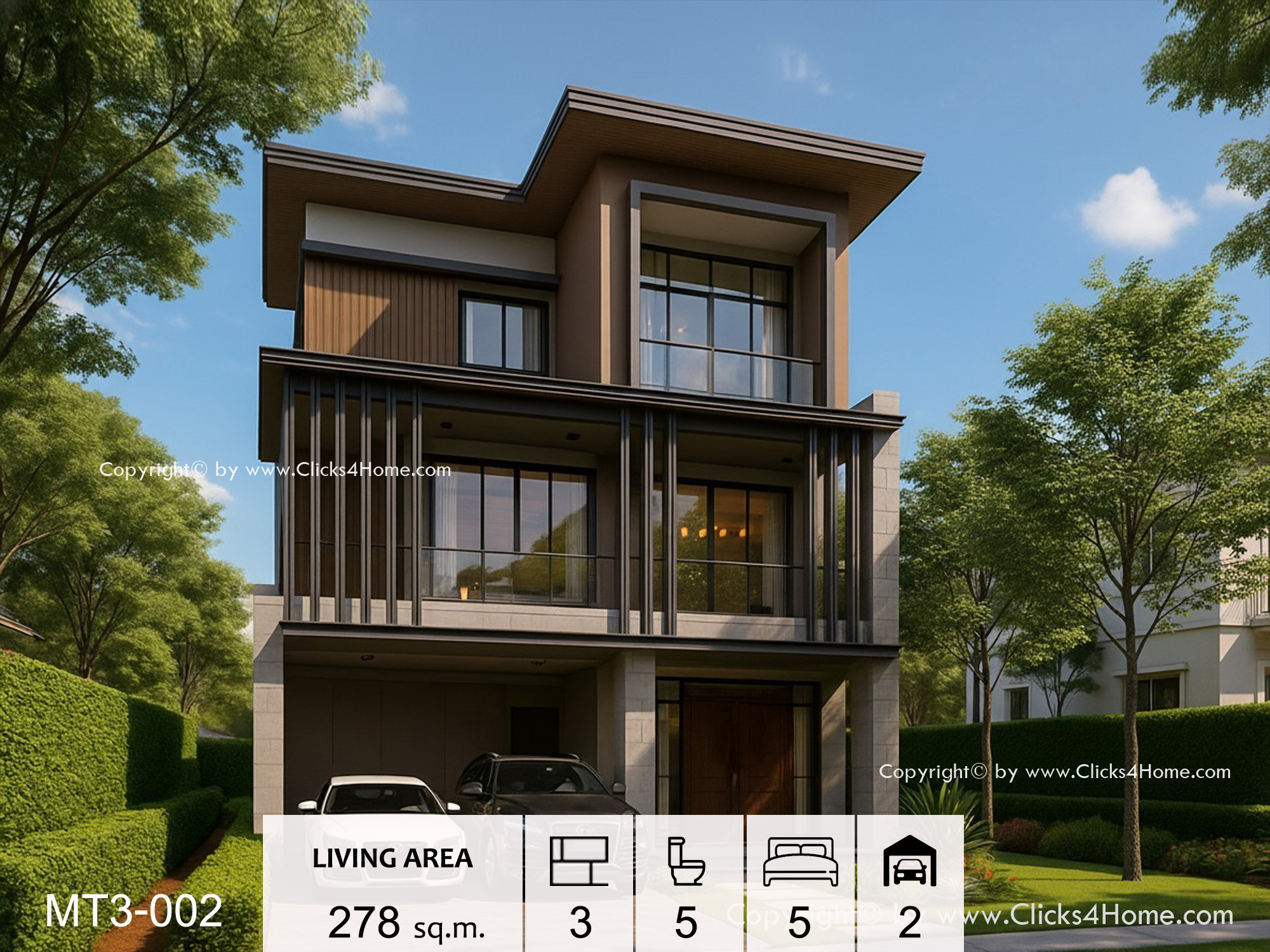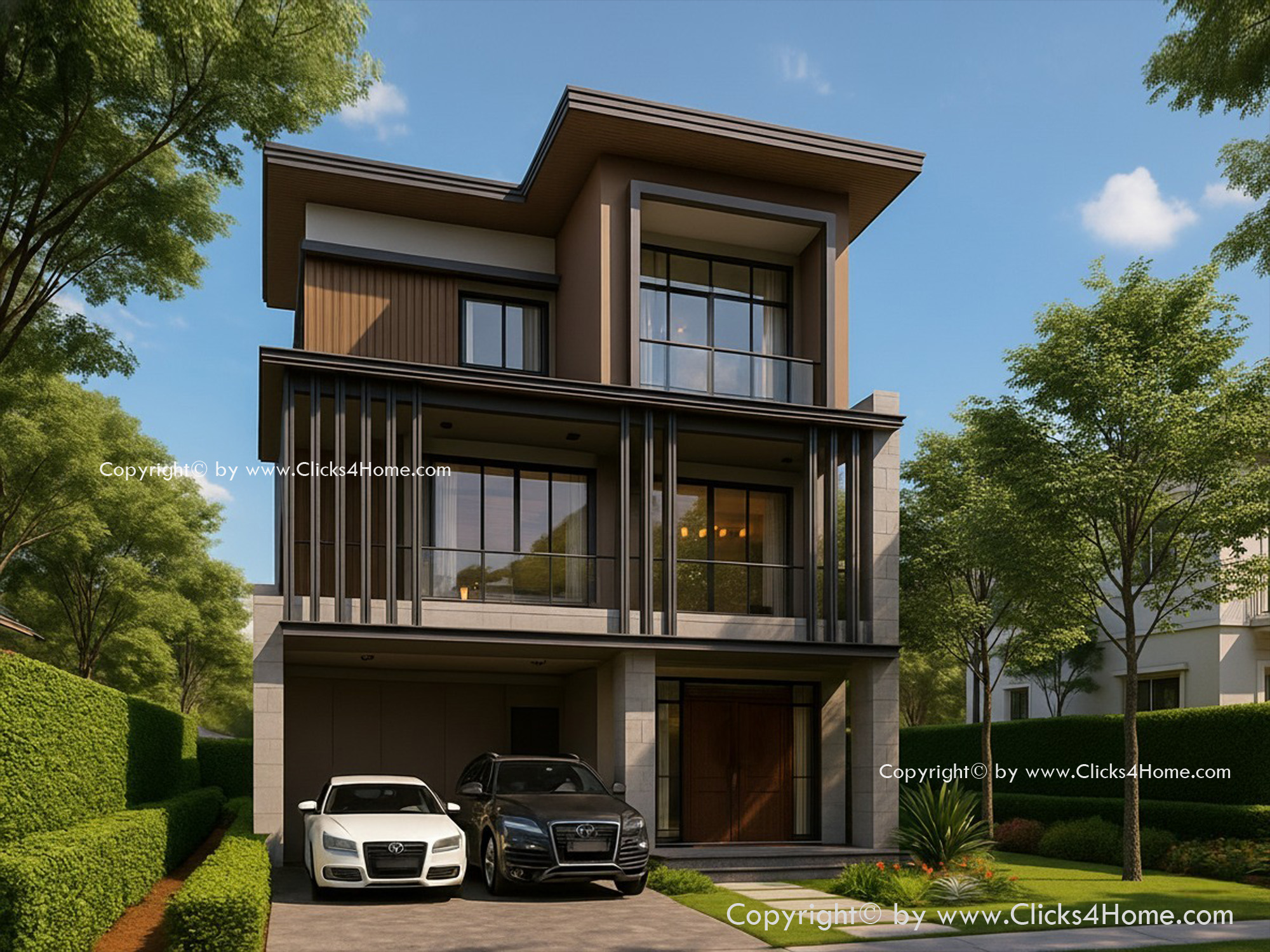 แบบบ้านสามชั้น สไตล์ Modern tropical โดดเด่นด้วยการจัดพื้นที่รับแขก ให้ต่อเนื่องกับส่วนทานอาหาร จึงดูกว้างขวาง และโปร่งโล่งสบาย ด้วยหน้าต่างทรงสูงขนาดใหญ่ ที่ทั้งช่วยระบายอากาศ และรับแสงสว่างจากให้บ้านดูสว่างไม่มืดทึม ห้องทานอาหาร ซึ่งTake view สวนข้างบ้านผ่านประตูบานเลื่อนขนาดใหญ่ ต่อเนื่องกับ ห้องครัวทางด้านหลังบ้าน เพื่อการใช้งานที่ต่อเนื่องกัน นอกจากนี้ทางด้านหลังบ้าน ยังจัดให้มีห้องนอนขนาดกลาง พร้อมห้องน้ำในตัว ที่คุณสามารถปรับเปลี่ยนเป็นห้องดูหนังฟังเพลง หรือห้องทำการบ้านของเด็กๆ ที่เป็นสัดส่วน และเงียบสงบ ที่ชั้นสอง มีห้องนั่งเล่นสำหรับทุกคนในครอบครัวให้ได้นั่งพักผ่อนเป็นส่วนตัว มีห้องนอนขนาดใหญ่ และเล็กซึ่งมีห้องน้ำในตัวทั้งสองห้อง อีก 2 ห้อง ส่วนชั้น 3 มีส่วนนั่งเล่นขนาดเล็ก และห้องนอนใหญ่ 1 ห้อง ที่มีส่วนนอนขนาดใหญ่ และห้องน้ำส่วนตัว ด้วยการออกแบบที่คำนึงถึงประโยชน์ใช้สอยภายใน และดีไซน์ภายนอกที่ทันสมัย จึงทำให้บ้านหลังนี้ตอบโจทย์ทุกการใช้งานได้อย่างเต็มที่