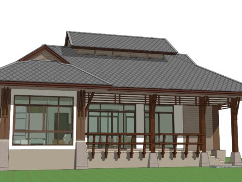 แบบบ้านหลังเล็ก สไตล์ Tropical เส้นสายของหลังคาผสานกับเส้นนอนของระแนงไม้แบบสถาปัตยกรรมเมืองร้อน การจัดผังตัวอาคาร ต้องการให้เกิดความโปร่งโล่งสบายของห้องนั่งเล่นดูทีวี จึงจัดให้โล่งยาวต่อเนื่องกับส่วนทานอาหาร แล้วเชื่อมกับส่วนครัวทางด้านหลัง ส่วนทางด้านข้าง จัดให้เป็นส่วนของห้องนอน ด้านหนึ่งเป็นห้องนอนใหญ่ ที่มีห้องน้ำในตัว ส่วนห้องนอนเล็ก 2 ห้องนั้น ก็ใช้ห้องน้ำแขก ซึ่งเป็นห้องน้ำส่วนกลางร่วมกัน ห้องนอนทุกห้อง ตั้งใจออกแบบให้มีช่องเปิดหลายด้าน ให้มีการระบายอากาศที่ดี และมีแสงธรรมชาติเข้าถึง เพื่อสุขอนามัยที่ดีของคนในครอบครัว เรียกว่าแม้จะเป็นบ้านหลังเล็ก แต่ออกแบบให้ใช้งานคุ้มค่า ได้ความสะดวกสบาย ในทุกตารางนิ้ว เหมาะกับครอบครัวขนาดเล็ก หรือเป็นบ้านพักผ่อน รับรองว่าทั้งในด้านการใช้สอย และรูปร่างหน้าตาภายนอก ต้องถูกใจทุกคนในบ้านอย่างแน่นอน