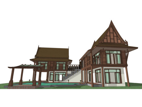แบบบ้านเรือนไทย ที่ออกแบบผังอาคาร แบบเรือนกลุ่ม รูปตัวแอล ( L ) ใช้คอนเซ็ปต์บ้านคอร์ท คือทุกห้องหันเข้าหาส่วนคอร์ทกลาง รูปทรงภายนอก เน้นรูปแบบของสถาปัตยกรรมแบบไทยภาคกลาง ที่แฝงรูปแบบการใช้ชีวิตแบบคนรุ่นใหม่ ด้วยประตูหน้าต่างทรงสูง ที่เปิดโล่ง แบบบ้านสมัยใหม่ ช่วยในการระบายอากาศได้เป็นอย่างดีแบบเรือนไทย โดดเด่นด้วยบันไดภายนอก 2 จุด คือด้านทางเข้า กับด้านที่ลงสู่สระว่ายน้ำ ที่ชั้นบน เรือนนอนทั้งสอง เชื่อมต่อกัน ด้วยชานโล่ง แบบบ้านภาคกลาง จัดเป็นพื้นที่พักผ่อนชื่นชมบรรยากาศรอบตัว ได้อารมณ์เหมือนพักรีสอร์ทหรู ในส่วนการวางผังอาคารที่ชั้นล่าง ได้จัดวางห้องรับแขก ทานอาหาร และครัวเปิดสไตล์อิตาเลี่ยน ให้ต่อเนื่องกับสระว่ายน้ำด้านหลังบ้าน เป็นพื้นที่รับรองแขก หรือญาติสนิทกลุ่มใหญ่ได้อย่างสบายๆ โดยจัดแยกเป็นสัดส่วนเพื่อความเป็นส่วนตัว ของห้องนอนชั้นล่าง เหมาะอย่างยิ่งสำหรับเจ้าของบ้านสมัยใหม่ ที่นิยมรูปแบบบ้านเรือนไทย บนไลฟ์สไตล์ใหม่ แบบครอบครัวสมัยใหม่ เช่นคุณ